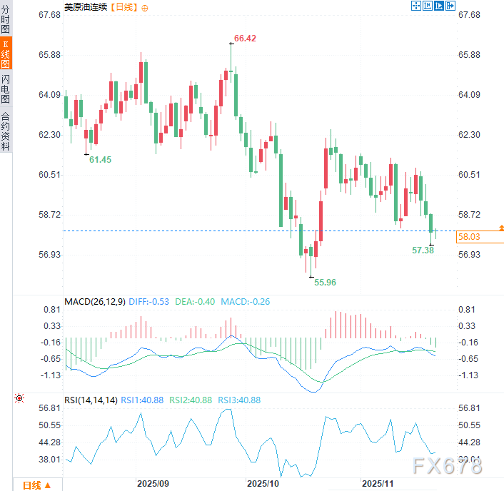周一美原油于58.05美元/桶附近震荡。油价上周累计跌幅约为3%,前一交易日曾一度达近一个月低点57.38美元/桶。