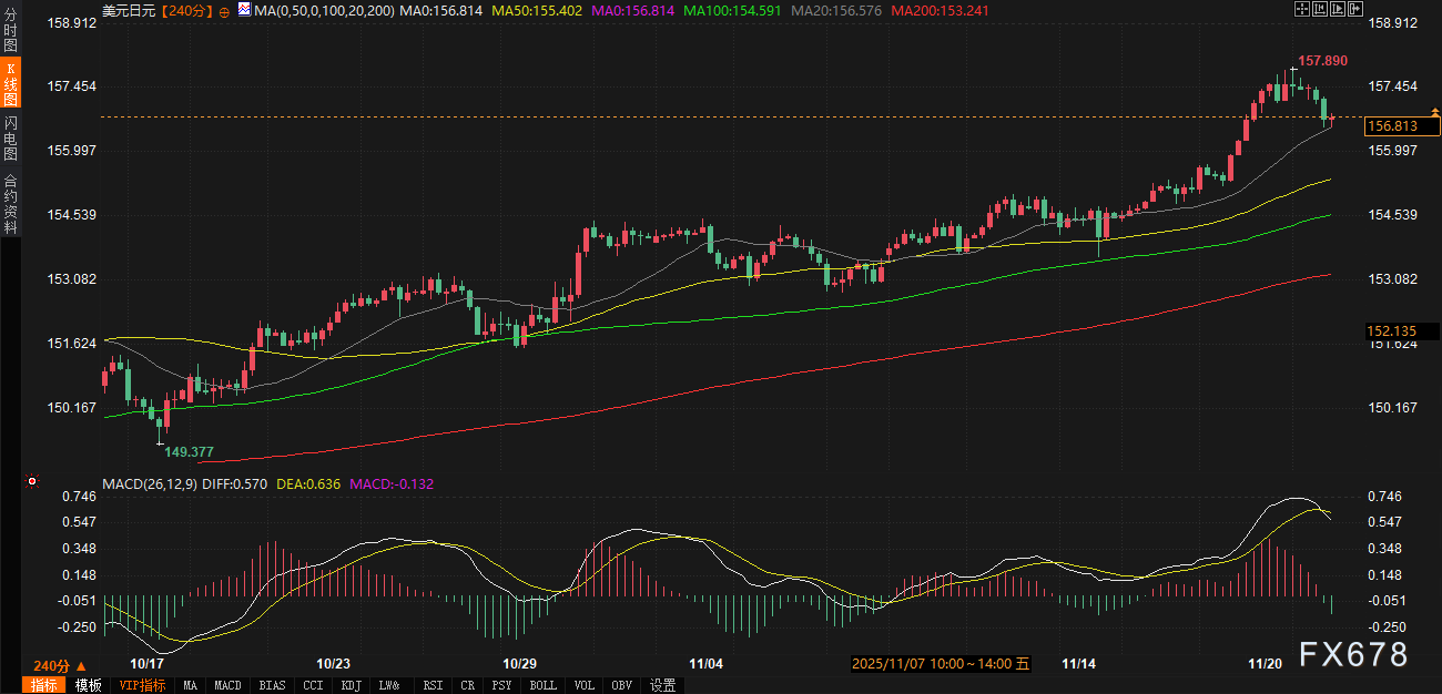 汇通财经APP讯——周五(11月21日),尽管美元兑日元日内小幅回调,汇价仍维持在近三十四年高位区间震荡。日本政府周