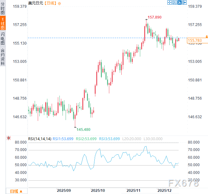 自11月以来,美元兑日元汇率较多在154-157区间波动。随着主张宽松货币政策的鹰派首相高市早苗于10月就职,日元已累计贬值超过2.5%。周五美元兑日元震荡走高,涨幅约0.19%。