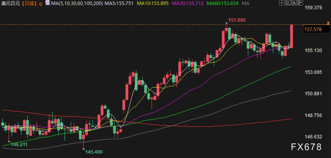 汇通财经APP讯——美元兑日元周五上涨,最高升至157.76,为四周来最高水平,创下10月初以来最大单日涨幅。日本央