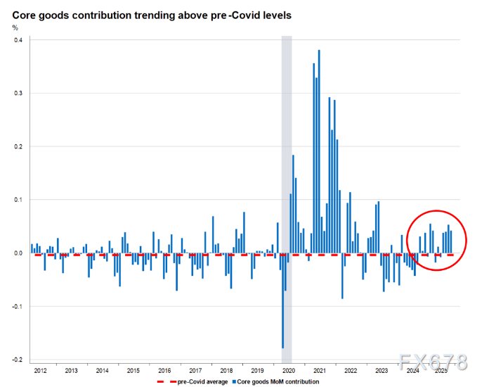 叠加关税政策影响后,测算下来2025年第三季度核心商品对核心CPI同比涨幅的贡献度提升了0.3个百分点,这一数值远高于新冠疫情前的正常水平。